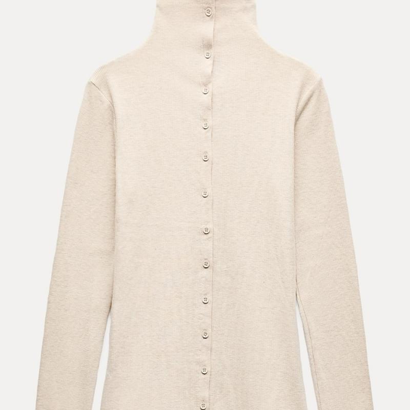 Лонг із високим комір-хомутом і довгими рукавами. Застібається на ґудзики в тон спереду
