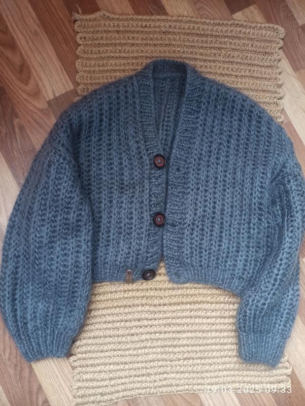 Класна в'язана кофтинка. Довжина рукава від шиї 78 см, від плеча 49. Рукав спущений, під проймою довжина рукава 40 см. Напівоб'єм грудей 60 см. Довжина виробу 47 см. Кофтинка не тоненька, тепла. Бірки про склад немає, реальний колір на другому фото.