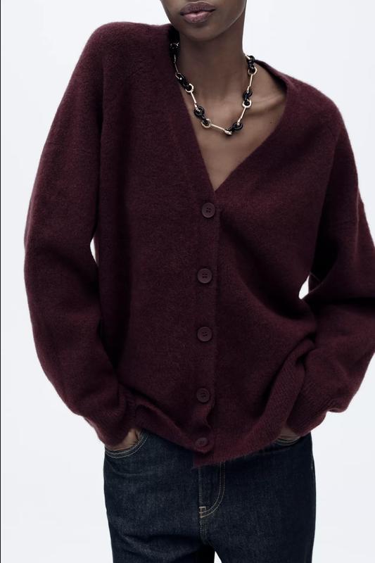 В наявності ✔️ Розмір S (Овер) Кардиган із V-подібним вирізом і довгими рукавами. Застібається на ґудзики спереду.В складі 6% вовни. Бордовий|