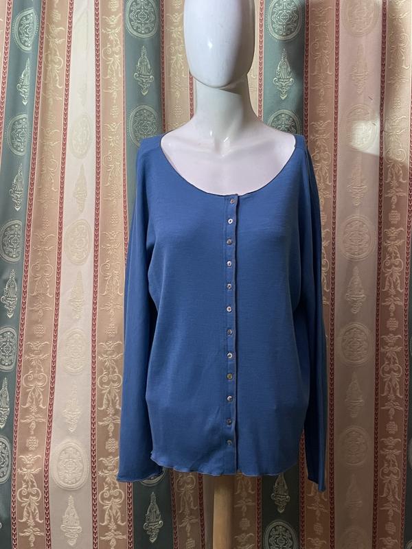 Пастельний голубий колір Зрізана бірка зі складом тканини, на ощуп схоже на вовну, тонка вʼязка Рукав 69 см ПОГ 53 см Довжина 60 см