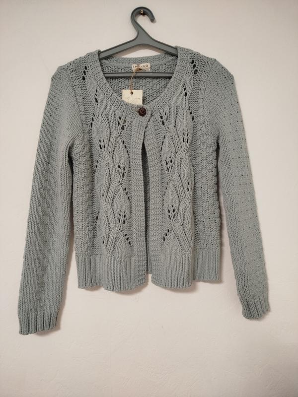 Ажурний стильний кардиган із котону, застібка гудзик, колір блідо блакитний. Розмір 12. Довжина 58, півобхват грудей 48, довжина рукава 62.