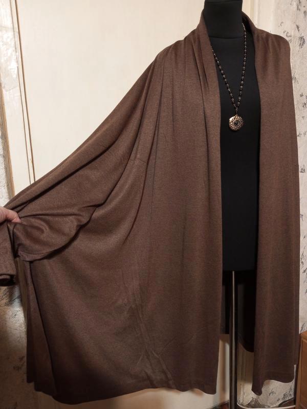 Елегантний, трикотажний -стрейч, кардиган дуже великого розміру, мега батал. Колір - охри-коричневий з вкрапленнями чорного; трикотаж середньої щільності, добре тримає форму. Всі бірки зрізані, але орієнтуйтеся за умовними вимірами, знятими по спинці: ПОГ - від пахви до пахви - 89см + добре тягнеться, ПО передньої полички - 59см + підворот + тягнеться + є виточки; ПОТ-по спинці - 100см +, ПОС по канту - 118см +, ПО нижньої полички попереду, в розкладеному стані -71см +; довжина від плеча – 90см; довжина по центру спинки - 87см, довжина рукава від горловини -75см, ПО біцепса 37,5/58см Приємний до тіла, жіночний, камуфлює недоліки. Підійде і на вихід, і на кожен день. Див. мої оголошення - є кардигани - кофти, куртки, піджаки і 90% одягу великого розміру. Підписуйтесь на сторінку - щодня оновлення одягом королівських розмірів і не тільки. Перепитуйте, зроблю додаткові виміри та фото. Повернення немає-оголошення платні. Купуючи кілька товарів-Ви заощаджуєте на пересиланні, лоти комбінуються. Прохання: перед покупкою ознайомитися з рубрикою "ПРО МЕНЕ" Склад: бірка зрізана, приємний на дотик трикотаж Доставка: Перешлю в ін.міста - за Ваш рахунок - при повній оплаті на картку