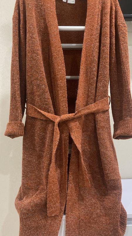Кардиган рудого кольору, під пояс, заміри готового виробу в стані спокою пог70см, пос70см, довж. рукава від плеча( плече опущене) 56см, , довж. 97см