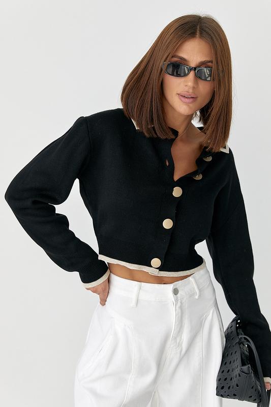 Короткий кардиган із контрастною окантовкою — елегантна та стильна модель, яка поєднує класичний фасон і сучасні деталі. Завдяки приталеному крою кардиган підкреслює фігуру, а м’яка в’язка забезпечує комфорт і зручність у носінні. Модель має відкладний комірець і застібається на золотисті ґудзики, що додають образу вишуканості. Контрастна окантовка на комірі, рукавах і понизу створює виразний акцент, роблячи кардиган особливим. Довгі рукави та низ виробу завершені манжетами, які надають силуету акуратності. Такий кардиган стане універсальним елементом гардероба — він чудово поєднується з класичними штанами, спідницями чи джинсами, створюючи як ділові, так і більш повсякденні стильні образи. Склад тканини 85% акрил, 7% поліамід, 8% еластан Заміри виробу Довжина переду виробу, см 42см Довжина рукава від горловини, см 69см Ширина під проймами рукавів (над грудьми), см 46см Довжина рукава від горловини, см 45см