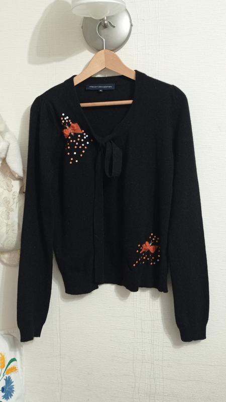В стані нової речі, красива благородна кофтинка. Завєязкється зверху, без застібки. Розмір М, склад - неймовіргий: вовна, ангора і 9 відсотків домішків, див бірку. Плечі - 37, рукав - 70, під пахвами - 47, довжина - 59.