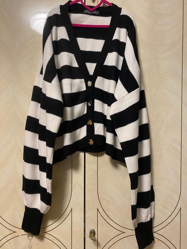 Кардиган в актуальну смужку вкорочений.Дуде красиві буфер -рукави.Стан нового.Йде оверсайз.Розмір універсальний.