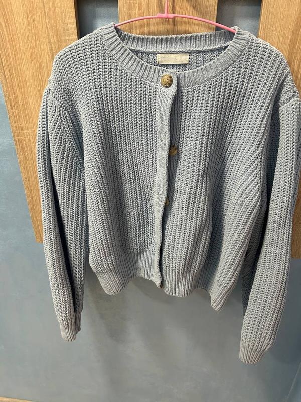 М’який і затишний в’язаний кардиган у стильному сірому кольорі. Має об’ємний крій, зручний для щоденного носіння. Великі декоративні ґудзики додають акценту й роблять образ стильним та сучасним. Ідеально підходить для прохолодних днів — комбінується з джинсами, сукнями чи базовими футболками. 👕 Деталі: Колір: блакитний Фасон: вільний / oversize Застібка: ґудзики спереду Стан: дуже добрий, без плям і затяжок Розмір: L (oversize посадка)