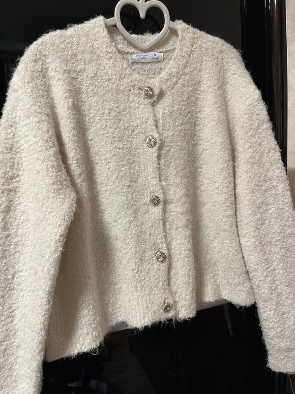 Укорочена кофта кардиган на ґудзиках. Матеріал букле, присутня вовна в складі, приємна тепла. Розмір вказаний M. Пог 58см, довжина 52см, довжина рукава 60см. Колір молочний, ґудзики в золотистому кольорі. Стан ідеальний.