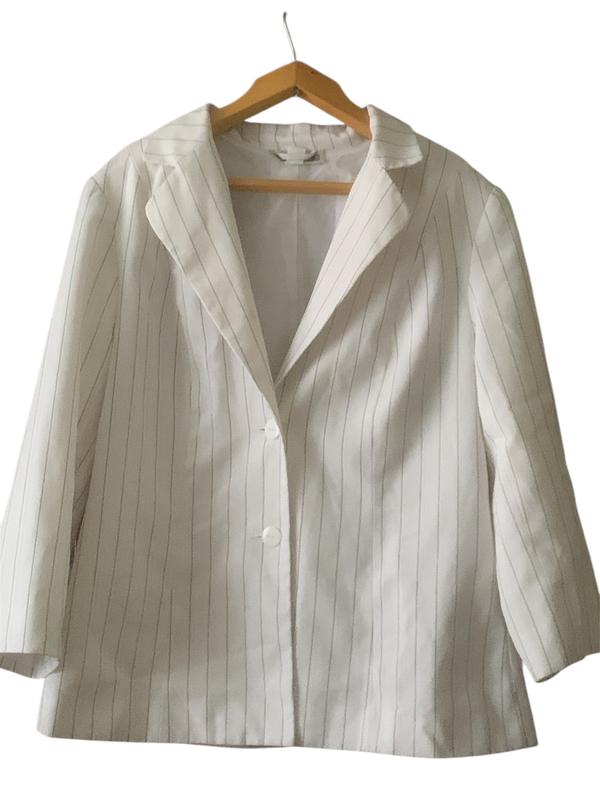 Піджак розміру М-Л, білий в чорну полоску. Має невеликі плями на комірі, можна виділити.