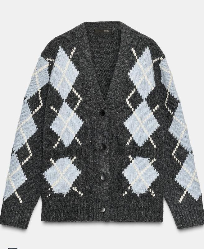 В наявності! Новий кардиган Zara, колекція зима 2025-2026. Колір сірий/блакитний. Склад: 100% вовняної пряжі. V-подібний виріз горловини та довгі рукави. Накладні кишені спереду. Застібка на ґудзики спереду. Ребриста обробка. Кардиган великомірить, розмір М на бірці, але підійде на L.