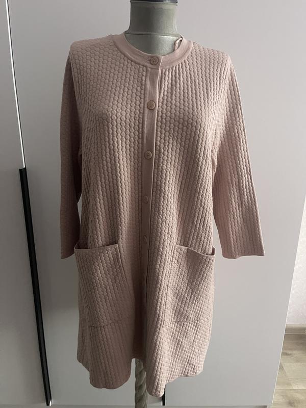 Кардиган COS з фактурного матеріалу рожевого кольору з накладними кишенями і застібкою спереду на кнопках.