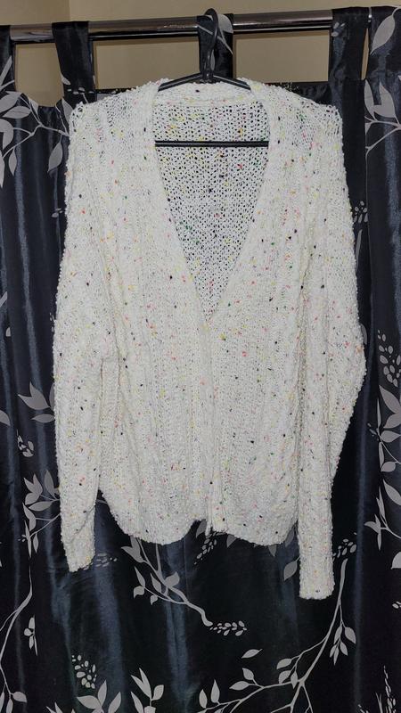 кофта-кардиган большого размера, цвет кремовый,плечо спущено, нитка с разноцветными пупырышками,на ощупь очень мягкая,ог и об 130+, рукав от ворота 83, длина 63.