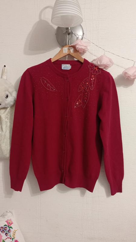 Ніжний та теплий кардиган у глибокому ягідному кольорі. Справжня знахідка для поціновувачів якісного вінтажу та естетики Coquette / Grandma core. Головні переваги: Склад класу люкс: 20% ангора (дає легкий пухнастий ефект), 70% вовна ягняти (lambswool — дуже тепла та м'яка), 10% нейлон (для тримання форми). Декор: вишукана вишивка бісером, стеклярусом та паєтками у формі квітів та листя. Виглядає дуже жіночно та святково. Стан: ідеальний (vintage), без ковтунців, зачіпок чи втрат бісеру. Характеристики: Бренд: Sampa Sound (вінтаж). Розмір: вказано M (добре сяде на S-M, дивіться заміри). Колір: насичений темно-червоний.
