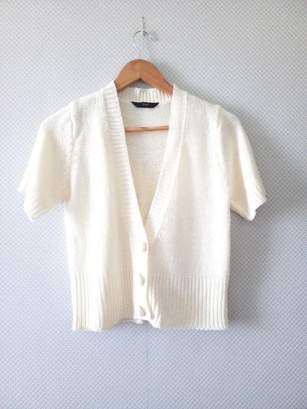 Базовий кардиган, топ вершкового кольору. Укорочена модель, що застібається на обв'язані ґудзики. Стан ідеальний. Розмір по бірці 14.