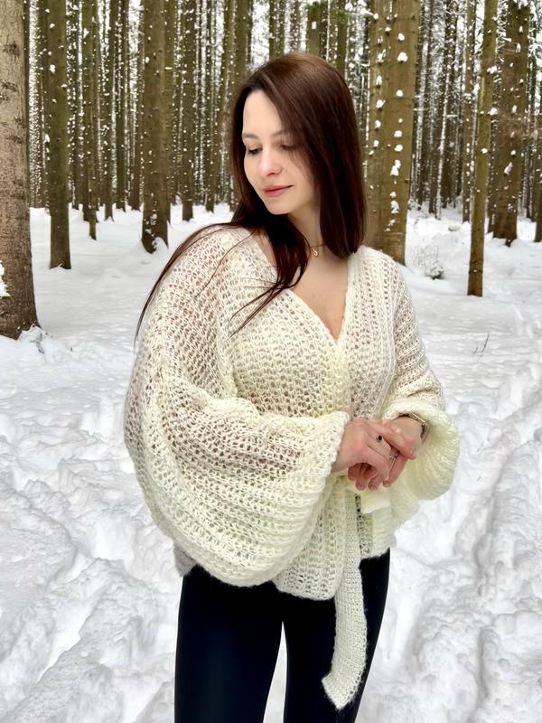 Кардиган молочного кольору, на запах, ручна робота. Можна носити вільно, без паска Розмір універсальний, s-l Павутинка мохер з переплетенням шовкової нитки . Вдягнуто на зріст 165 см Можна зробити у будь якому іншому кольорі