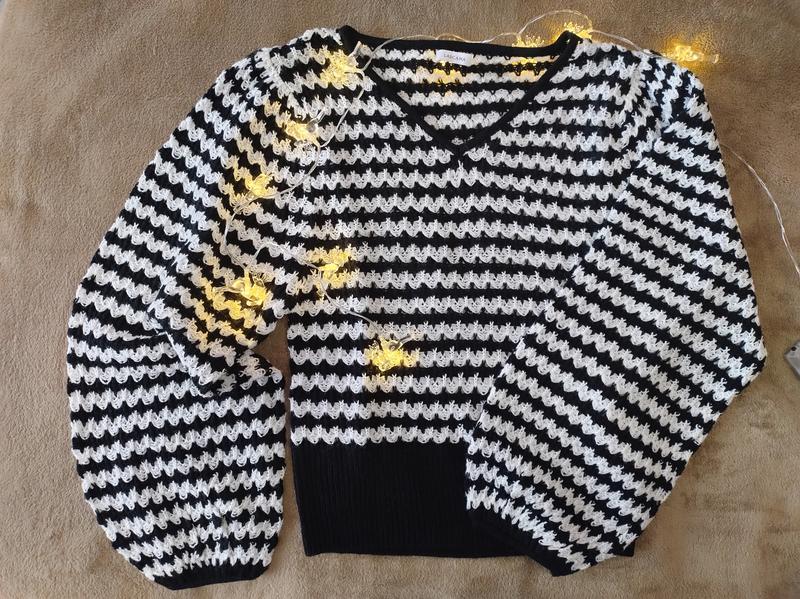 Кофта тоненька в'язка, дуже приємна на дотик. Укорочена, рукави об'ємні. Розмір по бірці л, але краще сяде на м.