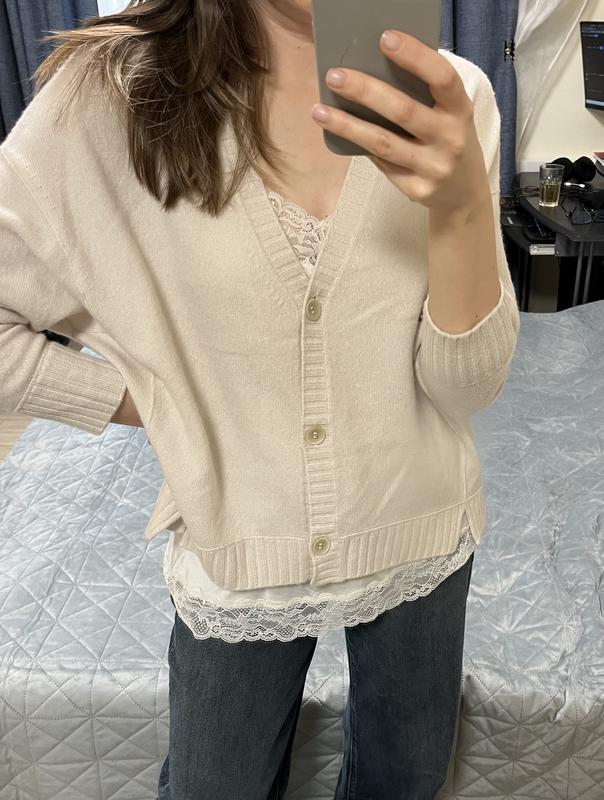 Кашеміровий кардиганчик, ніжного бежевого- молочного кольору, йде як оверсайз, підійде на розмір М -Л, бірка зі складом відрізана, але без сумніву це кршемір, без нюансів