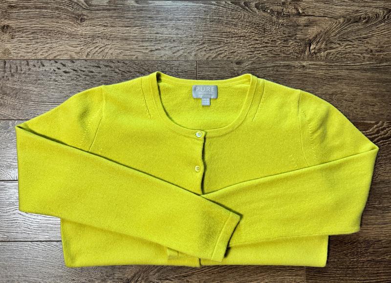 Кофта немецкого бренда Pure Collection.,цвет жёлтый (лимонный),состав-100% кашемир,размер 42(L-XL),замеры (п/обьём 54, плечи 40, длина рукава по внешнему шву 65, по внутреннему 49, длина изделия 62).Состояние идеальное.