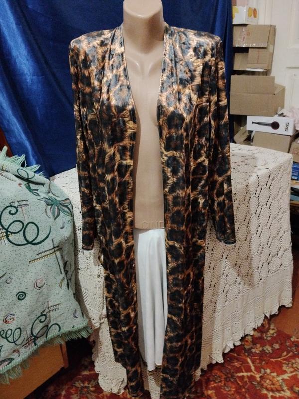 дуже гарний довгий тигровий кардіган з розрізами по бокам.Тканина єластична, добре тягнеться.Розмір с,м,л.Не застібається. опис стан отлічний довжина 113 рукав 57 ширина груді 48 ширина бедер 50