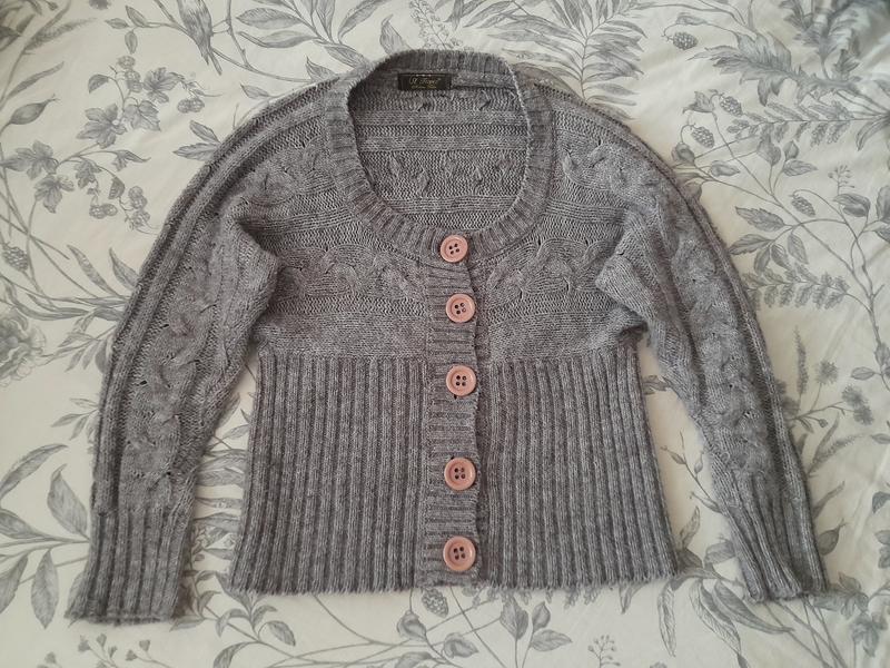Легка, тепленька кофтина на ґудзиках. Довжина 53 см, НОГ 46, НОТ 43, горловина 21, рукав від горловини 59.