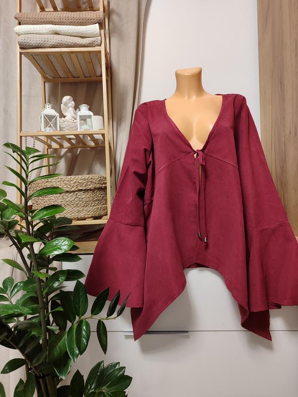 Дуже красивий глухий малиновий відтінок, асиметричний перед, делікатна зав'язка. Річ дуже стильна і трендова! Легко комбінується. Довжина перед 65, зад 85, ПОГ ПОГ 65, вказано розмір 3 ХЛ. Прошу підписуватися, є багато гарних речей і часте оновлення товару!