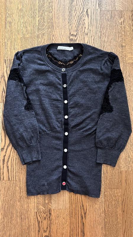 Кардиган жіночий вовна з мереживом, від бренду Karen Millen, в дуже хорошому стані, є маленький не значний нюанс, на фото на ризинці знизу трохи потертість, в ціні враховується, розмір XS, S
