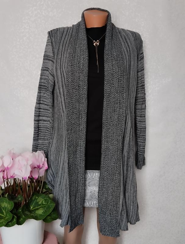 Класний подовжений кардиган без бічних швів, книзу розкльошений. Бірок немає, розмір універсальний, дивіться заміри: довжина 90 рукав 60 плечі 43-53 пог 56-74+++ пос 68-92+++, добре тягнеться