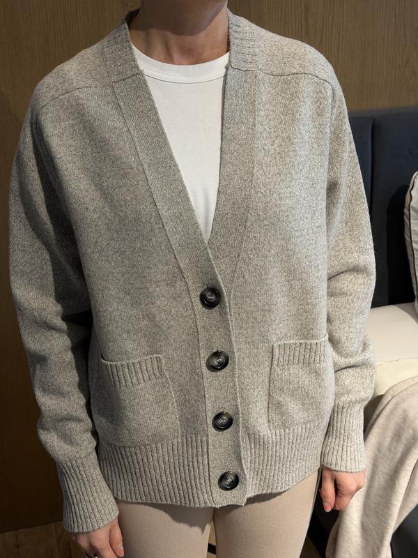 Стильний в’язаний кардиган від бренду Pull in Love. Класичний крій з V-подібним вирізом, застібка на ґудзики та накладні кишені. М’який, приємний до тіла трикотаж, комфортний для щоденного носіння. Базова річ у світло-сірому відтінку, яка легко поєднується з джинсами, брюками або спідницями. Підійде для демісезону та прохолодних днів.