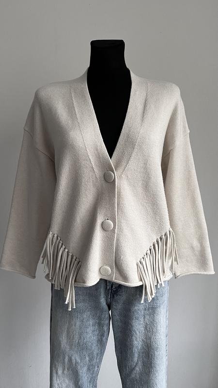 Бежевий кардиган з бахромою 50% віскоза, 30% поліестер, 20% нейлон Стан ідеальний Розмір С Півобхват грудей - 54 см Довжина рукава від горловини - 62 см Довжина -56 см