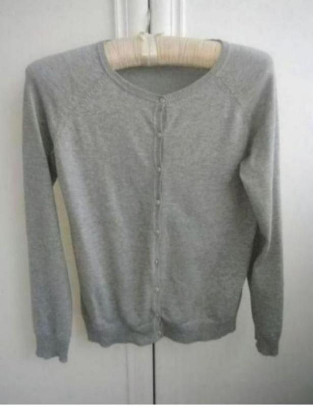Мила кофточка на ґудзиках дуже приємна на дотик. На бірці р. EUR L Заміри: Напівобхват грудей 47 см, тягнеться до 56 см Напівобхват талії 42 см Напівобхват стегон 40 см, тягнеться до 60 см Длина изделия 60см Довжина рукава реглана 67 см. Дефектів, дірочок, плям, ковтунців немає. Склад: 70%котон, 30%нейлон Колір: сірий меланж (мікс світло-сірий із сірим)
