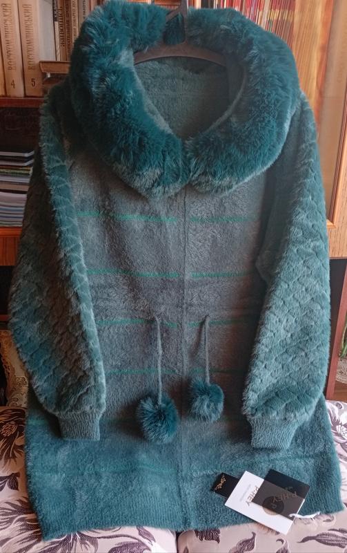 Новий кардиган смарагдового кольору з капюшоном і шикарним штучним хутром, орієнтуйтесь на 4 фото, бо камера передає погано. Тканина м'яка, приємна до тіла, має гарну розтяжність. Довжина 84см, НОГ 61см, НОТ 59см, НОС 62см, плече+рукав 74см. Є кишені, на талії куліска, хутро з капюшона знімається. Підійде орієнтовно на зріст 170-175см та об'єм 118-122см.