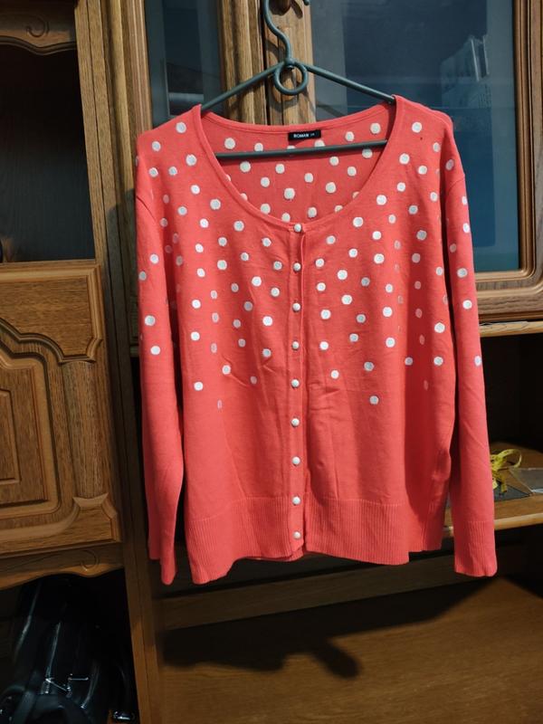 Кардиган новий, але.. ззаду на спині, є полосочки, трохи світліші, як вигорівші. При носінні не дуже замітно. Колір : кораловий чи лососевий. Заміри на форо