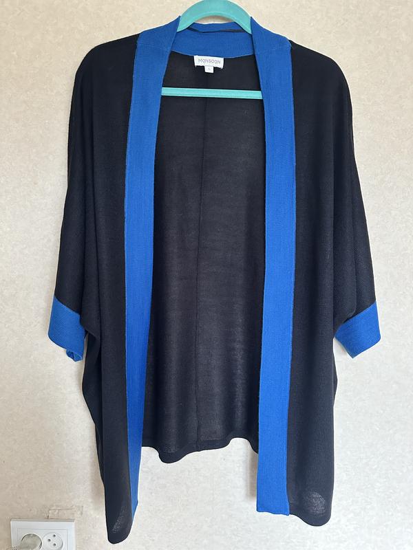 Кардиган без застібки ( по типу кімоно) від Monsoon. Приємний тактильно трикотаж-не грубий і мякенький; В складі: 85%~акрил і 15%~вовна. Розмір L,але завдяки фасону може бути від M до XL. Стан ідеальний, без нюансів.