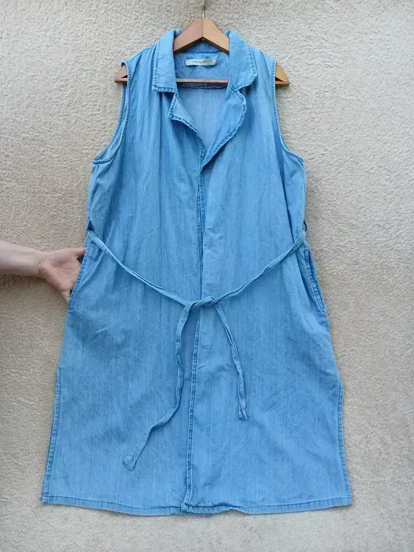 Джинсовий кардиган без застібки з кишенями та пояском, бавовна, можна вставити змійку — буде як плаття, становлення ідеал На спинці, під пахвами 58, НО стегна 60, довжина 109 Замери відзнаки половина
