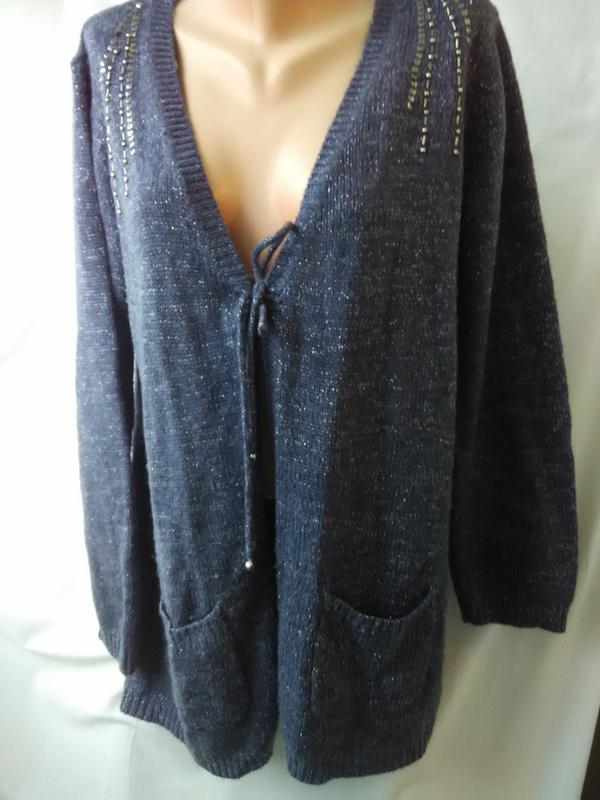 В'язаний сірий кардиган з рюлексовой ниткою Довжина по спинці - 73 см ПО грудях - 63 см Довжина рукава - 64 см Плечі - 43 см Виміри в спокійному стані. Добре тягнеться, дуже м'який та приємний до тіла.