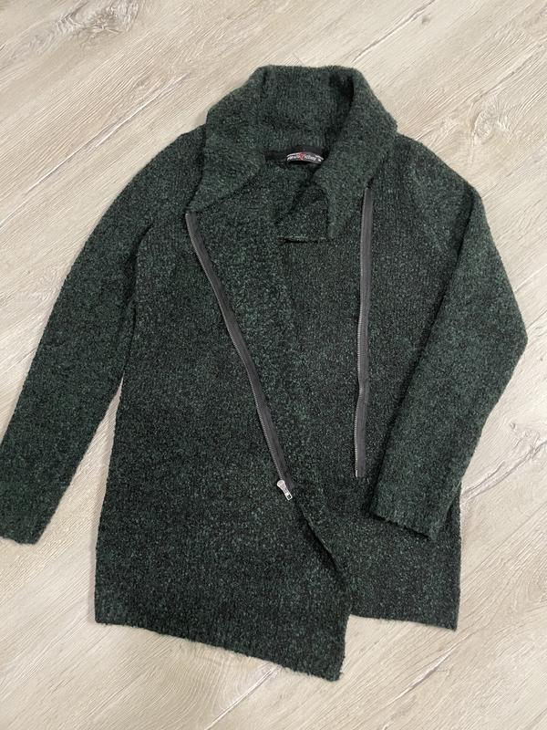 Якісний мʼякий кардиган на замку,з ниток букле красивого смарагдово чорного кольору,розмір M-L,довжина від плеча 72,ширина 50, плечі 39, рукав 64.