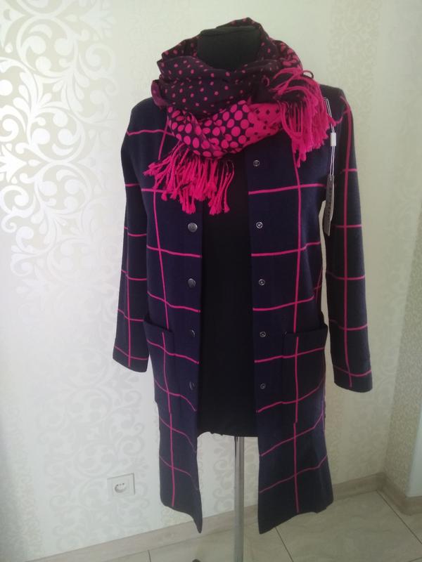 Трикотажний кардиган дуже хорошої якості, синього кольору з рожевою смужкою, можна носити замість плаща