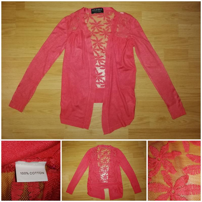 Кораловий світер-кардіган. Не має застібок. Спинка повністю ажурна, прозора.