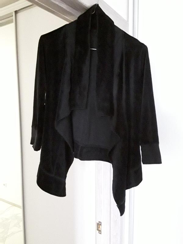 Велюровий чорний ,з широким хвилясті наложеним коміром. Довжина від шиї до низу - 49см. Ширина - 44см. Довжина рукава (3/4) - 40см. Розмір десь- S. Склад : 75% - cotton, 25% - поліестер.