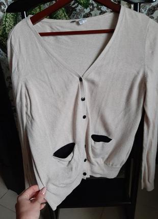 красива, приємна до тіла кофтинка на гудзиках. на жаль немає 1 гудзички і є невелика дірочка на рукаві ззаду.