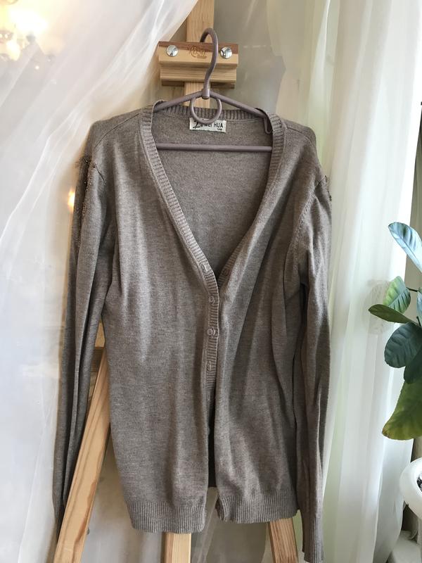 Кардіган світло-коричневого кольору з червоними вставками на рукавах. Розмір S/M