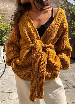 Стильний кардиган оверсайз з поясом. Пряжа зі Скандинавії(Норвегія). Класичний крій, нічого зайвого. Об'ємна в'язка і сама нитка робить кардиган унікальним, він виглядає дуже ефектно і стильно.В складі вовна альпака, абсолютно не колючий, дуже комфортно в ньому знаходитися. У палітрі більше 30 відтінків. Доступний до замовлення. Довжина 65-70 см, ширина 55-60 см або виконаємо за Вашими мірками.