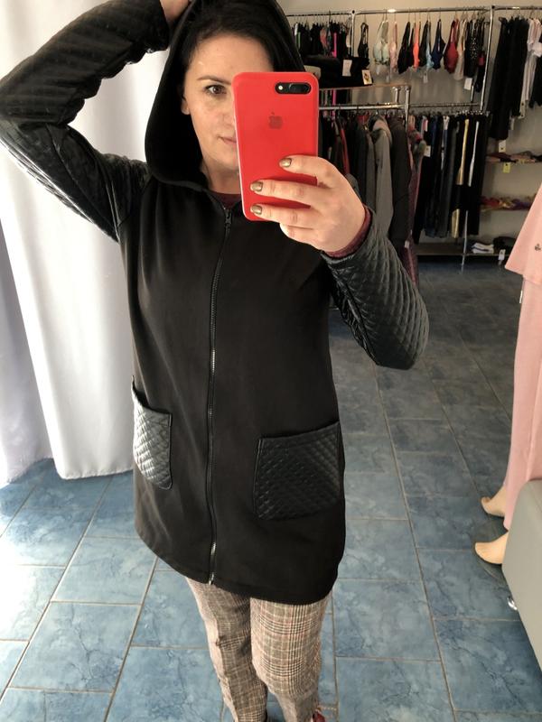 мод,Н017 - Кардиган розміри , 48, 50, 52, , матеріал - трикотаж трехнитка (20% cotton, 78% поліестер, 2% elastane) , рукава і накладні кишені - стьобана екокожа Зручна і стильна модель кардігана з капюшоном. Рукава виконані з стьобаною екошкіра, модель застібається на блискавку і декорована накладними кишенями