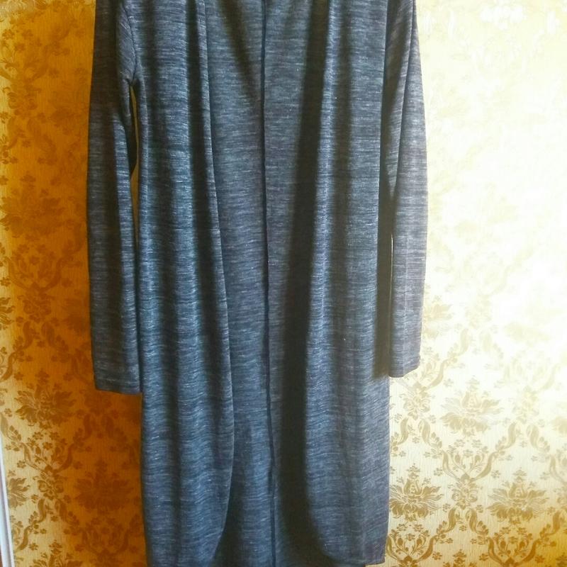 Серый кардиган из тонкого трикотажа, сзади длиннее, впереди короче. Длина по спинке 105, рукав 56, длина впереди 87, пог 40