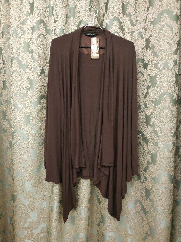 Легкий кардиган шоколадного кольору шикарного якості. Тканина дуже ніжна, приємна до тіла, м'яко добре тягнеться. Склад 88 % модал, 11% еластан, 1% поліестер. Підійде на L-XL. Стан нового Стік з бірками Є дві маленькі зацепочки з внутрішньої сторони шовкової подкладочки На зовнішній вигляд не впливає заміри по спинці по плічках 40 см пог 50 см ( попереду полотно поличок широкий - на будь-об'єм грудей буде добре) піт 44.5 см ширина по низу 52 см Дл.рукава 63 см і 48 см про низу пройми ДІ 75 см і 51.5 см від низу пройми Кардіган дуже комфортний, практичний, приємний на дотик і чудово виглядає)