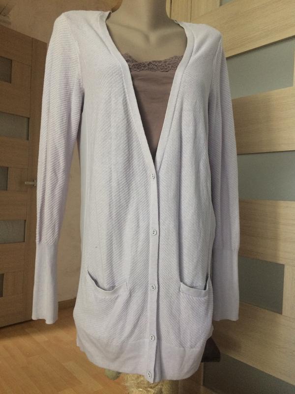 Подовжений кардиган ніжного блідого нюдового лавандового кольору Приємний тонкий трикотаж , з боків і зверху на спинці вставки з напівпрозорого шифону Склад: 60% бавовна та 40% rayon Розмір вказаний L Мірки : плечі 40, рукав 67, ПОГ 49, довжина по спинці 74 см