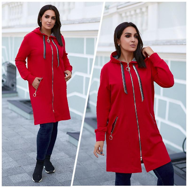 Кардиган Мод. 5098/35 Цена: 570 грн Размер: XXL, 3XL, 4XL, 5XL Маркировка: 50, 52, 54, 56 Цвет: чёрный, красный, лиловый, фиолет Материал: турецкая 2-х нитка (пенье), тянется средне. Свободный крой. Подкладка капюшона - люрикс. Двусторонняя змейка.