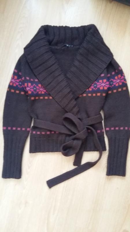 Тепленька кофточка, на поясі. Можна носити як курточку. Темно коричнева з арнаментом. дуже тепла! товста в'язка. Розмір s-m стан відмінний!