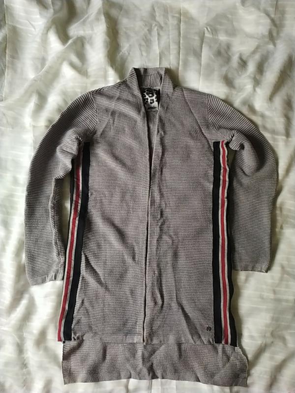 Кардиган в спортивном стиле. Состояние нового , но без бирки .Интересная вязка в рубчик , не колется , приятный к телу .Размер на наш 44- 46 - 48 , смотрите пожалуйста замеры .От подмышки до подмышки 50см .Длина спереди 76 см . Длина сзади 87 см .Рукав от плечевого шва 60 см . Перешлю новой почтой . Доставка за счёт покупателя .