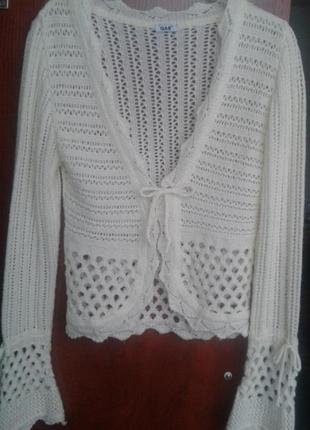 Гарна якісна кофта молочного кольору,тепла. Розмір регулюється Зав'язки на рукавах знімаються. одягнена на параметри: 84-65 - 93 зріст 1.65 Заміри: Довжина виробу 50см Рукав 66см В плечах 36см Підмишки 38см